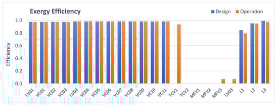 The exergy destroyed and the exergy efficiency of the valves and lines are presented in Figure 7 and Figure 8, respectively. Most of the refrigeration cycle valves have high efficiencies, with values close to 98%. The first stage mini-flow valve (MFV3) and the first stage level control valve (LV03) showed efficiencies below 10% in the operation case. Note that these valves were not predicted in the design case. The suction lines (L1 to L3) also showed high efficiencies, above 80% but had a low generation of irreversibilities.