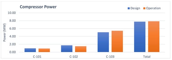 - Operation case: This case represents the current refrigerant cycle operational condition. A stable operating period was selected, that had similar throughput and process conditions to the design case. The data were collected, treated, and inputted in the model. In this scenario, the performance of the refrigerant compressor is calculated using the real operating data.