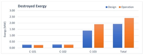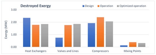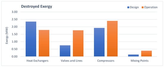 - Mixing points: The higher exergy destruction in operation is due to the greater temperature difference between the streams at the suction of the first stage.