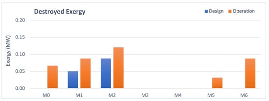 Equation (13) shows that the amount of exergy destroyed in the control valves is directly linked to the flowrate of this device. In the evaluation of the cycle in question, the process conditions (temperature and pressure) in both scenarios are similar, so that the specific exergy does not change significantly. Thus, the difference in flowrate between the two evaluated cases appears to be the main cause for the difference in exergy destroyed in these devices.
