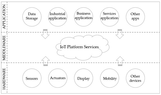 IIoT platforms were originated in the form of IoT middleware [12,13], with the intention to serve as an intermediary between the hardware and application layers. Following this idea, powerful IT vendors such as SAP HANA, GE Predix or RFID4U show in their catalogs a structure similar to that proposed in Figure 4. An advantage of IIoT platforms is that they support integration with almost any connected device and blend with third-party applications used by the device. This independence between hardware and software allows a single platform to manage any type of device in the same direct way.