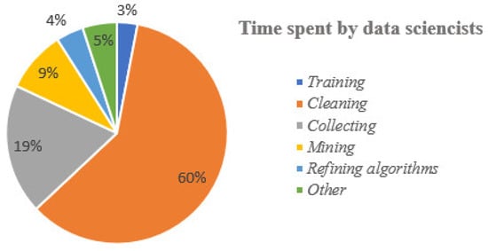 The time spent by data scientists in the processing and preparation of data represents almost 80% of their work [18], as shown in Figure 5. This work, which includes the collection, cleaning and organization of data, is undoubtedly the slowest task faced by data analysts.