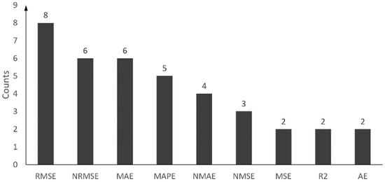 To assess the performance of the wind power forecasting methods, there are several statistical metrics, which can show the deviations of forecasted from measured wind power. The statistical description of how evaluation criteria were chosen in prior research was outlined in Figure 2, which is based on the information from Table 5, Table 6 and Table 7. As reflected in Figure 2, the majority of studies involved a selective number of evaluation criteria such as RMSE, NRMSE, MAE and mean absolute percentage error (MAPE). In the following, the types of techniques for the accuracy assessment of wind power forecasting methods are discussed in detail.