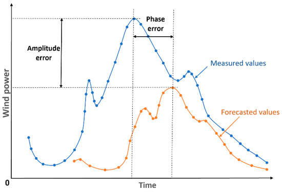 The amplitude error shows if the predicted power is overestimated or underestimated, but the phase error is a result of a timing shift between forecasted and real data (Figure 3). With these two types of errors, the standard deviation error (SDE) can be defined [5]: