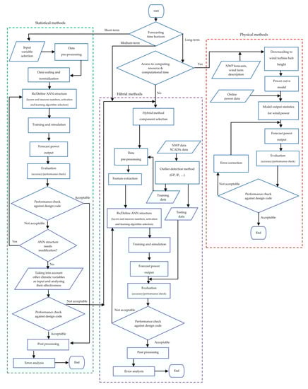 Few published investigations, which have carried out wind power forecasting studies in recent years [5,8,9], have been large enough to provide reliable estimates or guide for comparing different predictive methods. Additionally, the details of used approaches, such as dataset volume and performance evaluation factors, have not been qualitatively identified. In this paper, while explaining critical factors that differentiate the methods, an attempt has been made to compare different forecasting methods. On the other hand, a flowchart/roadmap was developed to choose the most appropriate and the most efficient method based on the various conditions, including available data, time horizons and so on.