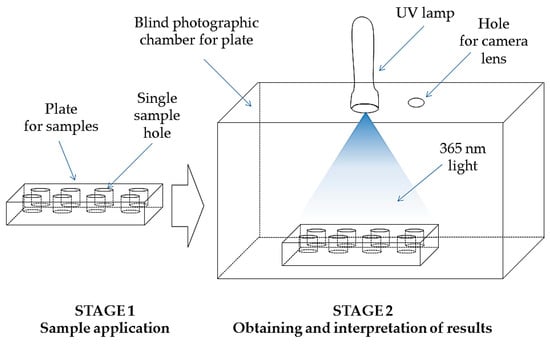 The drop test is based on the phenomenon of fluorescence. The tested oil sample is illuminated with a mercury lamp emitting light with a wavelength λ = 365 nm. The tested material (20 µL) is introduced into a cylindrical hollow on a black, matte plate (90 × 50 × 10 mm) with eight holes (each hole 10 mm in diameter and 7 mm deep). The plate is placed in a blind photographic chamber. The ultraviolet light with an excitation wavelength λ = 365 nm is emitted onto the plate by LED lamp (Manufacturer: MR Chemie, Unna, Germany). The illuminated sample plate is photographed (camera Xiaomi Mi A2 Lite, resolution 4240 × 2824 pix, matrix: 12 Mpx, Beijing, China) and evaluated. The performance of the test is presented in Figure 1 (Figure 1).