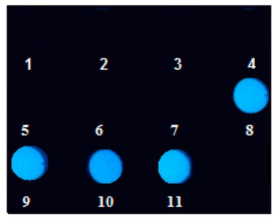 Photograph of oil drops of 11 samples applied to a black matte plate, placed in a dark place and illuminated with a UV LED lamp at λ = 365 nm. The sample type is presented in Table 1, please refer.