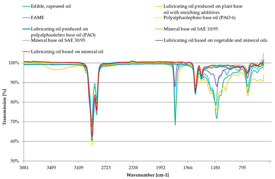 The signal for a wavenumber of about 1100 cm−1 occurs due to the stretching vibrations of C–O bonds, which are characteristic for ester molecular structures, it is a signal characteristic for oils of vegetable origin. Petroleum oils do not show any light absorption in this area. The absorbance at 1747 cm−1 wavelength occurs due to the presence of carbonyl molecular structures. The signal in this area is associated with the stretching vibrations of the C=O carbonyl group, present in oil ester bond. The signal is not found in petroleum oil, due to the lack of ester fraction. With the increase of the vegetable oil content, the content of carbonyl groups clearly increases, which is also reported in the literature [73,87,88]. The signals in the range of 1450–1350 cm−1 are derived from rocking vibration and scissor C-H bonds, which occur in an easily biodegradable oil base (of plant origin) and in an oil base derived from petroleum. Signals in these areas do not show the sense of sample differentiation. The stretching vibrations in the 2850–3100 cm−1 range, correspond to the bands of the C–H groups, characteristic for simple alkanes (in the 3000–2850 cm−1 range) and for alkenes and aromatic hydrocarbons (in the 3100–3000 cm−1 range). The small presence of these spectral fragments may take place when some groups of substances are added to the oil i.e., antioxidants. Vibrations in the 2850–3100 cm−1 range occur both in mineral and in vegetable oils.