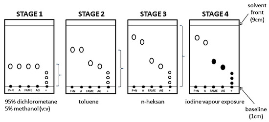 During the first stage (Figure 6), a mixture of dichloromethane and methanol was used as eluent (the highest elution strength), which allows the least polar components to be eluted from the start of the chromatogram i.e., ingredients of natural origin, acylglycerols (TAG, DAG, MAG), free fatty acids (FFA), FAME and refining additives produced on a natural basis. The remaining eluents would leave mentioned substances at the start. At this stage, the separation of individual groups of ingredients is not possible (stage 1, Figure 6). In the second stage, toluene is used as eluent. During the plate development in stage 2, weakly polar substances remain in place, while more polar substances are eluted. After this elution stage, the group of ingredients of natural and vegetable origin from a group of ingredients derived from processing of crude oil can be separated (stage 2, Figure 6). Paraffins and naphthenics are not separated from the aromatics and FAME from the natural components. Therefore, a third eluent-n-hexane, was applied. The elution strength of n-hexane is higher than of toluene, but lower than of a mixture of dichloromethane and methanol. This stage allows the separation of paraffin and naphthenic groups from aromatics. In addition, n-hexane elutes FAME, which allows this component to be identified. After completing three stage elution, the exposure of the plate to iodine vapors (stage 4, Figure 6), allows the visualization of components that have a double or ester bond in their structure.