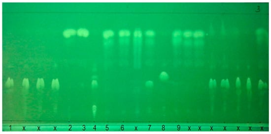 Chromatogram after third stage of plate development, l = 365 nm. The sample type is presented in Table 1, please refer; x—other commercially available lubricating oils.