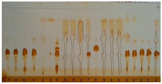 Chromatogram after fourth stage of plate visualization, i.e., after iodine vapor exposure. The sample type is presented in Table 1, please refer; x—other commercially available lubricating oils.