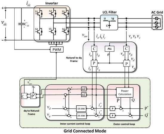 The type III controller-based DC-DC boost converter is assumed to supply 380 V whose input voltage is 80 V [55]. The LCL filter is used to connect the inverter with the grid [56,57]. The MPPT controller for RER or high-level energy management controller is utilized to set the and power references, respectively. For controller designed, Park and Clarke’s transformation based on dq theory is used to define control signals. The tuning of the d-axis well tune q-axis as the dynamics of both axes are similar [55]. The inverter is employed with Sinusoidal Pulse Width Modulation (SPWM) technique. Sliding mode Controller (SMC) based on the Super Twisting algorithm is designed to inject high quality fed in current into grid. This design will be discussed in the next section.