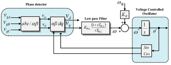 Currently, Phase Lock Loop (PLL) is widely used to synchronize PV plants to the power grid. The range of the PLL techniques is from a few hertz to gigahertz. There are three main PLL procedures for phase tracking, e.g., (a) zero-crossing based PLL, (b) stationary reference frame, and (c) Synchronous Reference Frame (SRF)-based PLL [54]. The SRF-PLL works accurately under distorted and nonideal grids and is applicable to both single phase and three-phase systems. The overall structure is presented in Figure 2. The voltage and are calculated from phase voltages , , using and transformation. The angle required in the transformation is computed by integrating the . The readers are encouraged for further details about PLL [54,55,58,59,60].