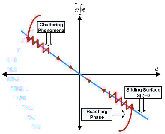 In SMC, the systems states are driven toward Sliding Surface (SS) [61,62]. The graphical interpretation of SMC is presented in Figure 3 [62]. After reaching SS the SMC keeps the states on the close neighborhood of the SS. The design of SMC consists of two parts SS and control law design.