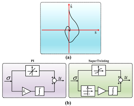 Without affecting the tracking performance and to avoid chattering, the Super Twisting ST-SMC is a viable alternative to the standard first-order SMC particularly intended for systems with relative degree 1. After describing a trajectory similar to one of the Twisting algorithms, this algorithm converges in finite time with a proper choice of parameters [63]. In ST-SMC the trajectories are twisting around the origin on the 2-sliding plane as presented in Figure 4a. The ST algorithm is a nonlinear version of the conventional PI controller presented in Figure 4b. The ST-SMC is highly suitable for real implementation and more immune to output measurement noise and possible errors in the estimation of [64]. The ST-SMC control law is composed of two terms. The discontinuous time derivative defines the first term, while the second term is a continuous function of the available sliding variable, which is present during the reaching phase only. The following control law defines the control algorithm [63,65,66]: