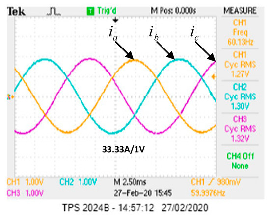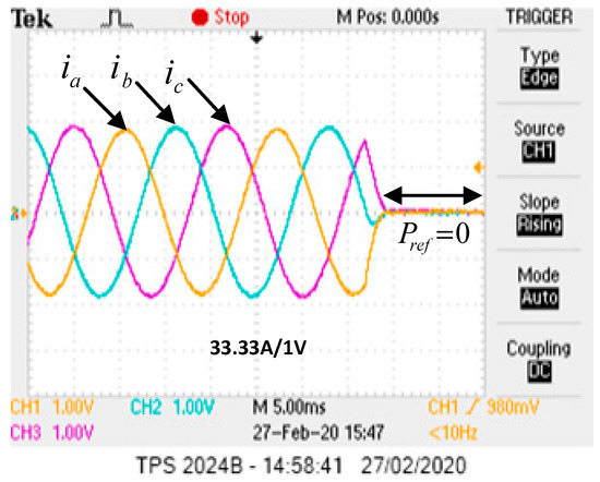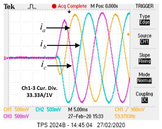 Three-phase output current in steady state for Pref = 10 kW and Qref = 0 kVAr.