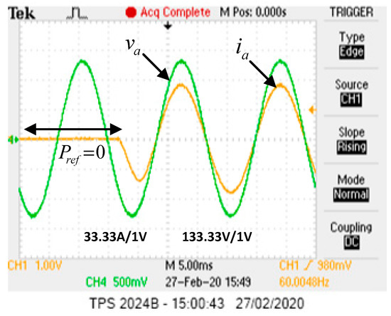 Voltage and current for phase A during Pref = 0 to Pref = 10 kW and Qref = 0.