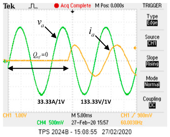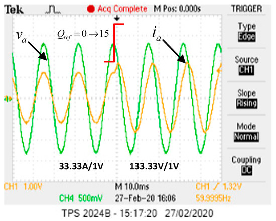 Voltage and current for phase A during Qref = 0 to Qref = 10kVAr and Pref = 0.