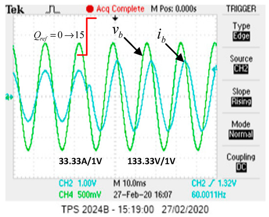 Voltage and current for phase B during Qref = 0 to Qref = 10 kVAr and Pref = 0.