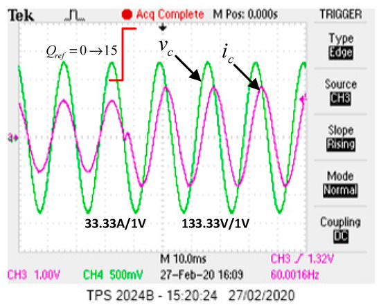 Voltage and current for phase C during Pref = 10 kW and transition from Qref = 0 to Qref = 15 kVar.
