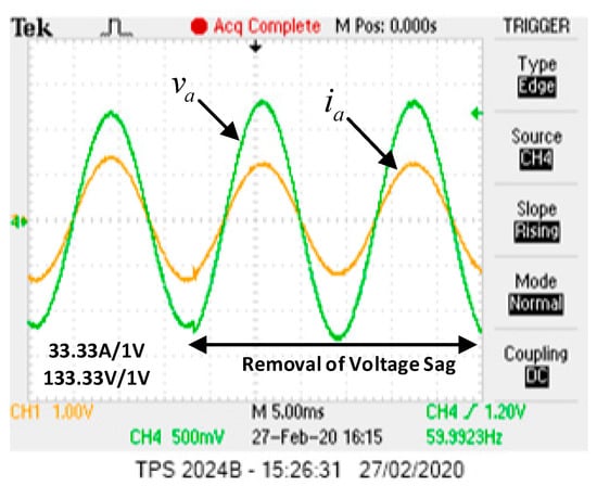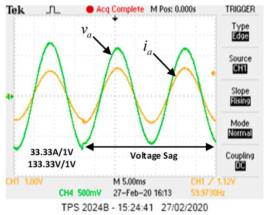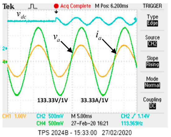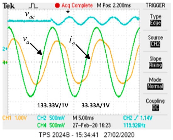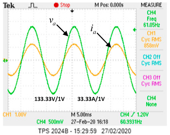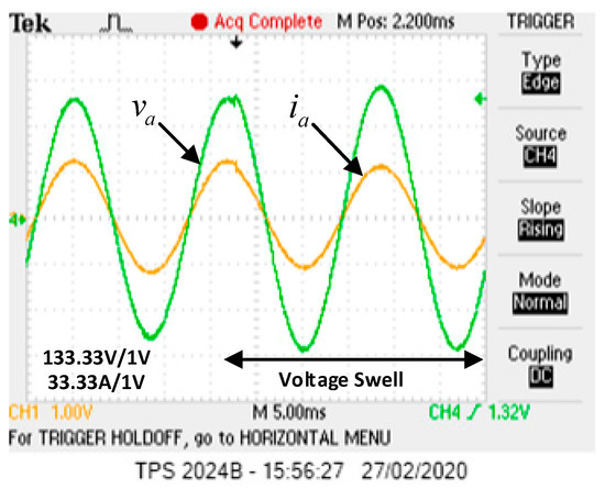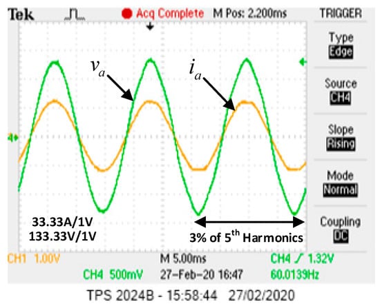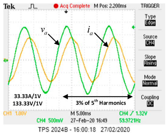 The design system is subjected to various perturbations and non-ideal conditions, i.e., voltage sag, voltage swell, frequency variation, DC-link variation, inclusion of 5th harmonics during injection of active power, reactive power, both cases, etc. Figure 18 presents voltage and current for phase A during a drop in the grid voltage from 120 Vrms to 108 Vrms with Pref = 10 kW and Qref = 0 kVAr, clearly highlighted by arrows. A small transient is shown at the start, which is recovered abruptly. The response is faster and chatter-free. Figure 19 shows the voltage and current for phase A during an increase in the grid voltage from 108 Vrms to 120 Vrms with Pref = 10 kW and Qref = 0 kVAr. When the normal value of grid voltage has restored, the effect of the disturbance is negligible indicating the fault-tolerant behavior of ST-SMC. Figure 20 introduces voltage and current for phase A during f = 61 Hz, Pref = 10 kW, and Qref = 0 kVAr. The controller shows insensitivity to frequency variation. Figure 21 depicts voltage and current for phase A during the inclusion of oscillation in the DC-link voltage 38V at 120 Hz having Pref = 10 kW and Qref = 0. The DC-link variation has no effect on the current and voltage; the PLL works efficiently. The current and voltage are in phase and oscillation free. Figure 22 illustrates voltage and current for phase A during VDC = 380 V + 38 V at 120 Hz with Pref = 10 kW and Qref = 10 kVar. Due to the injection of reactive power, a phase shift is noticed in the current and voltage; moreover, there is no effect on the symmetry of waveforms validating the effectiveness of the design controller. Figure 23 portrays voltage and current for phase A during a swell in the grid voltage from 120 Vrms to 132 Vrms. A small transient shows the insertion of the swell point out with double-headed arrow. The voltage and current are in the phase where the waveform is distortion free. Figure 24 describes voltage and current for phase A during inclusion of 3% of 5th harmonic in the grid voltage with 120 Vrms, Pref = 10 k, and Qref = 0. Figure 25 demonstrates voltage and current for phase A during the inclusion of 3% of 5th harmonic in the grid voltage (120 Vrms and Pref = 10 k Qref = 10 kvar). The above two Figures show the behavior of the currents and voltages during the inclusion of 5th harmonics. The injected currents have high quality under harmonic distortions, thus authenticating that the design control is reliable, efficient, and less insensitive to abnormal conditions and uncertainties.