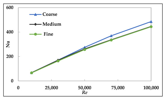 The predicted numbers versus numbers for all three grids were compared using pure water at inlet temperature of 320 K over a range of number (104–105) as shown in Figure 3. As can be seen, the coarse grid failed to predict the number in regimes of the high level of turbulence. After increasing the mesh size in all directions, the new medium mesh was able to capture the thermal physics precisely even in high turbulent-level regions. However, by increasing the mesh size further to Fine level did not change the results. Therefore, the medium grid was found to be the sufficient grid for the present study. The mesh properties of the medium size are (cell type: hexahedra, mesh average non-orthogonally: 8.1, maximum skewness is 0.7 and has no negative volume cell).