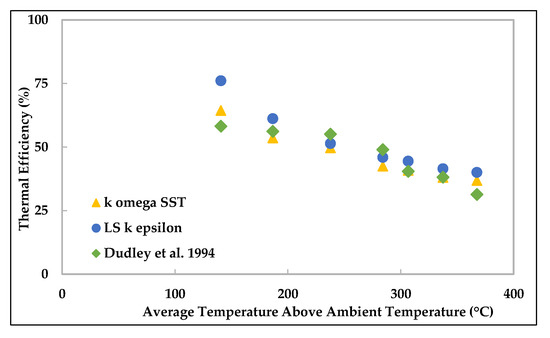 It can be observed from Table 7 that the k-ω SST model performed better as it predicted output temperatures, Tout closer to the experimental data with an average deviation of only 0.67%. The second parameter selected for the validation was the thermal efficiency of the parabolic trough collector with realistic heat flux boundary condition (non-uniform) on the external wall of the solar absorber. The numerical results produced by the considered turbulence models were validated with experimental measurements of the Dudley et al. [32] as presented in Figure 4.