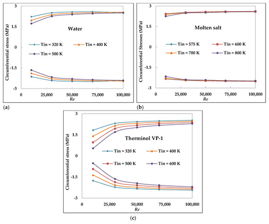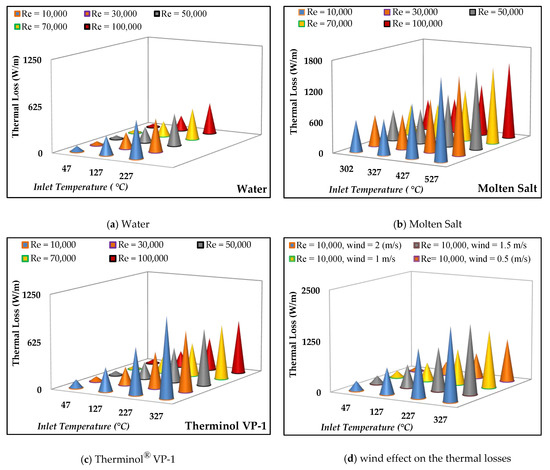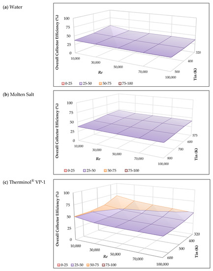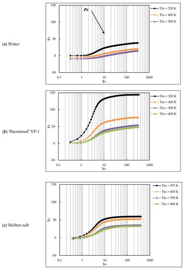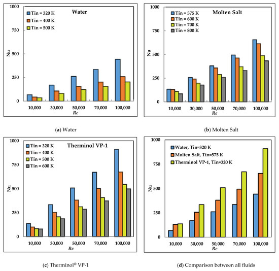 Figure 6a–c present the number as a function of the number at different inlet temperatures for the three working fluids; water, molten salt and therminol VP-1. It can be seen that the trend is similar for the numbers at the inlet temperatures of all working fluids. The number increases considerably as the number increases for all working fluids.
