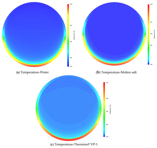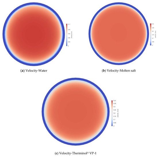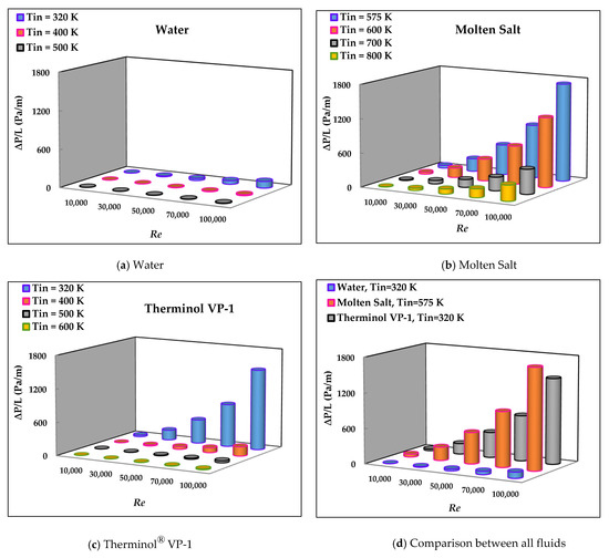Figure 7d presents the specific pressure drop distribution of all fluids at the smallest inlet temperature as a function of the number. It is very clear that the specific pressure drop of molten salt is the largest for all numbers followed by Therminol® VP-1 and then water. This is because the molten salt fluid flow characteristics (density and viscosity) are relatively higher compared to the other fluids; density approximately 1.8 and 2 times higher and viscosity approximately 2 and 5.7 times higher than that of Therminol® VP-1 and water, respectively. Overall, at the minimum fluid temperature and maximum number, the specific pressure drop predicted by molten salt is larger than that predicted by water and therminol VP-1 by 16.5 and 1.2 times, respectively.