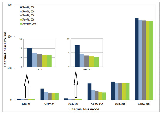 For the thermal loss analysis of the solar receiver, the main objective is to determine the major factor that affects these thermal losses when the glass envelope is removed. It is observed that the average temperature of the receiver’s outer surface is strongly dependent on the inlet fluid temperature. The smaller the inlet fluid temperature the lower the outer surface absorber’s temperature, consequently leading to a decrease in thermal losses thereby improving the thermal gain. Among the thermal losses of the solar receiver, the radiation loss is a function of forth-power absolute temperature difference between the outer surface temperature and sky temperature. Since the glass envelope is removed in this study, the outer surface of the solar receiver is greatly radiated. Therefore, the radiation thermal loss is quite sensitive to the absorber’s surface temperature rather than the ambient condition. Thus, radiation loss from absorber surface to the sky increase gradually. The second important contribution to thermal losses is the convection heat loss from the outer surface to the ambient air which is approximately from 60 to 70% as shown in Figure 8. This is in complete agreement with the findings of Dudley et al. [32]. These types of losses are a function of two important factors; the outside air heat transfer coefficient and the temperature difference between the receiver outer surface and ambient air.