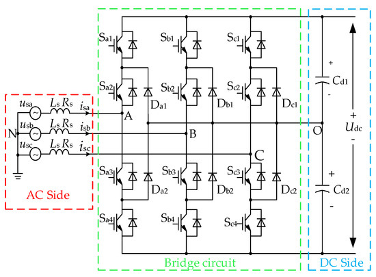 In this paper, the circuit topology of reversible three-phase PWM converter at the front end of motor driver power supply adopts neutral point clamped (NPC) I-type three-phase three-level circuit, as shown in Figure 2, which mainly includes the following three parts: AC side, bridge circuit, and DC side. usa, usb, and usc are the phase voltages of the AC side with the midpoint of N; Ls and Rs are the inductance and the equivalent resistance of the AC side, respectively; isa, isb, and isc are the currents at the AC side. Each phase of the three-phase bridge arm is composed of four insulated gate bipolar transistor (IGBT) switches Si1~Si4 (i = a,b,c) with freewheel diodes and two clamping diodes Di1~Di2 (i = a,b,c). Two bus capacitors (Cd1 and Cd2) of the same size are connected in series at the DC side. O is the midpoint of the capacitance, and Udc is the DC bus voltage.