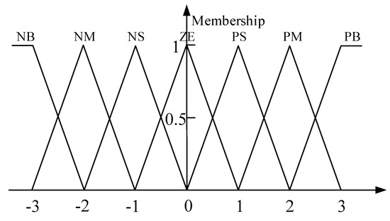 2) Considering that the input voltage error e and error change rate ec, as well as the output Δkp1 and Δki1 can change in positive and negative directions, the fuzzy universe is described by seven linguistic values: “Negative Big (NB),” “Negative Middle (NM),” “Negative Small (NS),” “Zero (ZE),” “Positive Small (PS),” “Positive Middle (PM),” and “Positive Big (PB).” Then, the quantized discrete set {−3, −2, −1, 0, 1, 2, 3} can be described as fuzzy language set {NB, NM, NS, ZE, PS, PM, PB}. The membership function of input and output is defined as a triangular membership function, as shown in Figure 5.