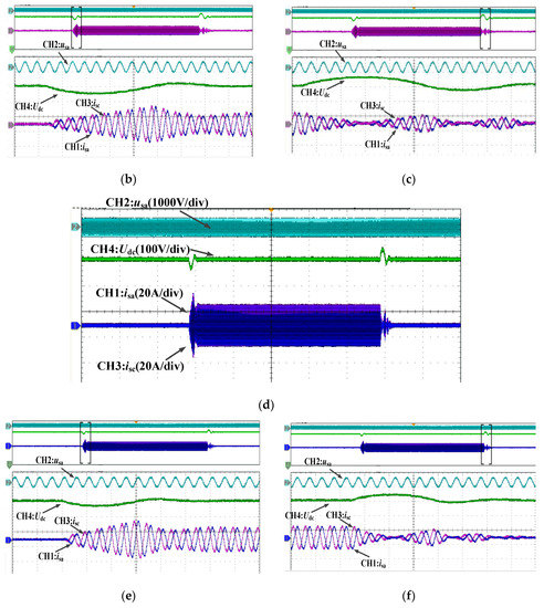 The rated operating condition of the front-end PWM converter is 220 V AC side phase voltage and 700 V DC bus voltage. Under the rated condition, the experiment of sudden loading and unloading is carried out for the reversible three-phase PWM converter with traditional PI controller and single fuzzy PI controller for the voltage outer loop respectively. The waveforms are shown in Figure 9. In Figure 9, CH1 is A-phase current waveform isa, CH2 is A-phase voltage waveform usa, CH3 is C-phase current waveform isc, and CH4 is DC bus voltage Udc waveform. Figure 9a shows the waveforms using traditional PI controller for voltage outer loop, and Figure 9d shows the waveform using traditional single fuzzy PI controller for voltage outer loop. Figure 9b,c,e,f shows the details of the waveforms when the load changes. For these two kinds of voltage controller, when sudden change of the load is from null load to half load, DC bus voltage was dropped and can be restored to the given voltage value after a short period of adjustment; while sudden change of the load is from half load to null load, the DC bus voltage overshot and can be restored to the given DC voltage value after a short period of adjustment. The experimental data of traditional PI controller and single fuzzy PI controller used in the voltage outer loop are shown in Table 7. From the Figure 9 and Table 7, it can be seen that the reversible three-phase PWM converter with traditional single fuzzy PI controller used in the voltage outer loop has smaller overshoot and drop, and faster dynamic response speed than the traditional PI controller.
