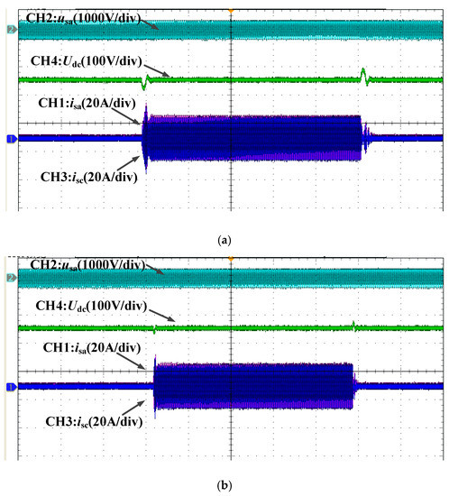 Through the design method of the traditional PI controller for the voltage outer loop introduced in Section 2, the optimal PI parameters in the Table 3 and Table 4 can be obtained, respectively, by calculation, simulation, and experiment under different AC voltage and DC given voltage conditions. Udc* is the DC bus given voltage and Uac_rms is the effective value of AC phase voltage.