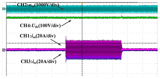 The selection of DC side capacitance should be considered. On the one hand, the larger the value of DC side capacitance, the better the filtering effect; on the other hand, considering the volume, weight, price, and dynamic characteristics, the value of DC side capacitance should not be too large. Therefore, two capacitances with different values are used for comparison. Figure 11b shows waveforms adopting double fuzzy PI controller with the 2950 μF DC side capacitance. Figure 12 shows waveforms adopting double fuzzy PI controller with the 1600 μF DC side capacitance. The experimental data of adopting 2950 μF and 1600 μF DC side capacitances with double fuzzy PI controller are shown in Table 9. Figure 11b and Table 9 show that using smaller DC side capacitance can make the dynamic response of the system faster.