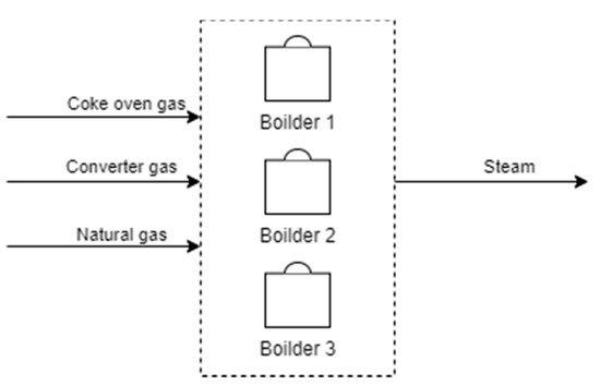 Compared to previous works, Kong et al. [12] proposed a model that simultaneously optimizes the distribution of by-product gases in the by-product gas system, the cogeneration system, and the iron- and steelmaking system. Qi et al. [13] developed a model for the plant-wide optimization of by-product gases to reduce the total cost. In their study, the authors proposed a more precise and objective penalty weight as a constraint in the function. De Oliveira et al. [14] presented a model to solve the problem of by-product fuel distribution to maximize energy utilization and assign appropriate weights to the objective function penalties, resulting in an increase in the operational performance of the fuel distribution system. Song et al. [15] noted that the dynamic optimization of surplus gas distribution has a very important position in the management of gas systems and established a common model. Zeng et al. [16] incorporated a novel multi-period model for the optimal distribution of by-product gases as steam and power. Different by-product gases can be mixed to satisfy the minimum heating and energy requirements of production units. Moreover, the authors introduced key practical features of by-product gases, steam, and power generation and distribution. Orre et al. [17] evaluated methods for decreasing the total energy demand and CO2 emissions in a system containing an integrated steel plant connected to a combined heat and power plant through optimized production operations for seasonal-dependent energy demands.