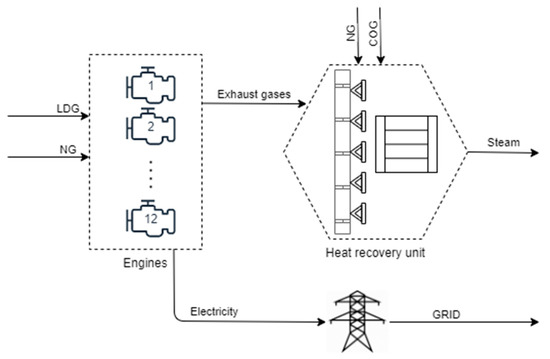 In an SGCP, these by-product gases are valorized by special engines to produce electricity in the electric plant and by boilers in the thermal plant to produce steam. Figure 1 provides a schematic view of the production process and subsequent use of the gases. The electric plant works only with LDG; meanwhile, the thermal plant runs mainly with COG but also with LDG or natural gas (NG) when the production of steelmaking gases is insufficient to supply the thermal energy required by the steel factory. The energy contained in the engine jacket water is also used to heat the boiler feed water up to 95 °C, and the energy of the engine exhaust gases is expelled at 500 °C for the production of recovery steam. This helps minimize thermal losses and reduces both the consumption of other resources and the emissions into the environment, as described in [6].