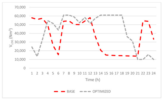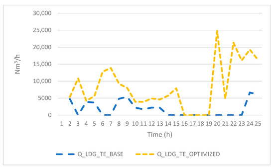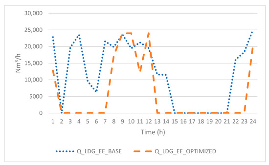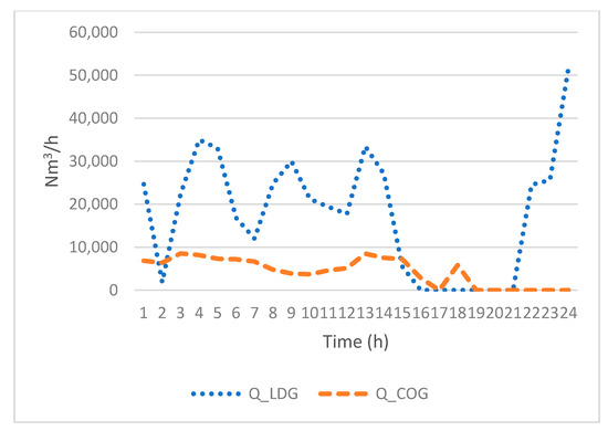 The analyzed temporal window (t) is 24 h. The electric power production (PREE) is calculated by multiplying the amount of LDG allocated for electric production by the heat value of LDG. The thermal value is calculated in a similar way while also considering the amount of each gas allocated (thermal production could be performed with any of the three gases).