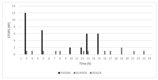 The efficiency of each type of equipment is shown in Table 4. Frequently starting and stopping the equipment should be avoided, which can be enforced by penalties. The penalty for each engine stop was established as 10 € due to the mandatory maintenance costs for every 2000 engine starts. For each burner stop, 5 € was established to avoid the risk of unwanted unavailability. Finally, 70 € was determined for each boiler stop to reduce the work of partial loads on the boilers and the consequent loss of performance, according to Zhao et al. [20]. These penalties were established according to the plant operators’ experience.