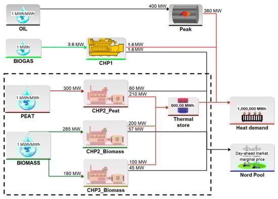 Four new models were constructed based on the validated reference model of 2019. Model 1 is essentially the model Reference with two distinct differences. An 800 MWh thermal storage was introduced in the power plant area, which corresponds to the 15,000 m3 hot water accumulator that was commissioned early in 2020. In addition, the ratio between the combustible fuels peat and biomass was changed from 40/60 to 20/80, as this is set as a goal by 2024 in the district heating company’s strategy [28]. No other changes were made on the plant configuration. Model 1 configuration is depicted in Figure 1. The two plants, CHP2_Peat and CHP2_Biomass, are physically the same plant, but during simulations, they alternate production according to the fuel used. Notice that power outputs differ slightly between the two, caused by different fuel heat values.