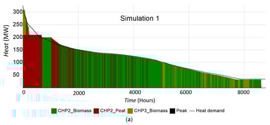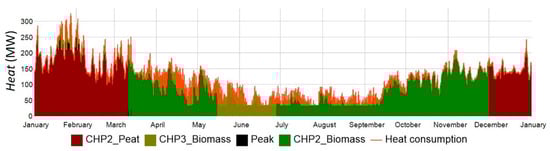 The heat demand profile, drawn in red in Figure 2, is used in all simulations. Heat demand is highest from January to February, resulting from cold outside temperatures, and lowest from June 1st to the beginning of September. The minimum heat load value seen in the figure during summer months is around 30 MW corresponding to the 30% constant heat demand, consisting mainly of domestic hot water consumption. As seen from the production profile, biomass is used from mid-May to the end of June in the smaller plant, CHP3, and during autumn and winter months with the larger plant, CHP2. During the coldest period from January to February, both plants operate simultaneously. During this time and partly in December and March, CHP2 uses only peat. The Peak plants are generally used in the rare cases, when CHP production does not cover the demand due to either lack of capacity or slow start-up.