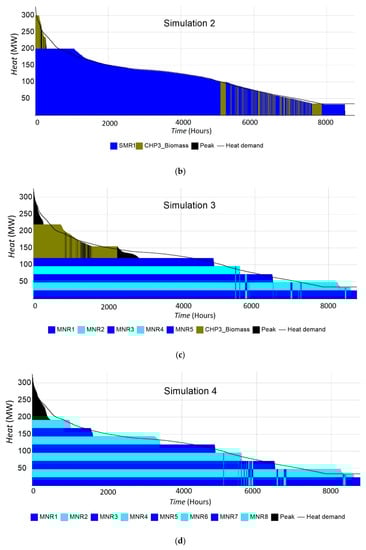 In Simulation 1, the operating hours of the CHP-plants are close to the reference case of 2019, although the operating hours of the peak plants are less as a result of implementing heat storage. This is seen in Figure 3a as gaps between the heat duration curve and the production profile. In Simulation 2 Figure 3b, the baseload is covered by the nuclear reactor SMR and peak demand is covered by biomass-fired CHP3. It can be seen from the figure that actual full load hours for the SMR are a little over 1000 and that most of the time, the SMR runs on reduced output. In Simulation 3 Figure 3c, the nuclear baseload capacity is less than in Simulation 2 and the five MNR units run mostly on full power when not on standby. Because in this case, CHP3 does not cover the coldest period demand entirely, oil-fired plants are needed to cover the peak demand. In Simulation 4, all but peak loads are covered with nuclear MNR units 1–8. The full load hours for the MNRs decrease as their number increases. Since SMR investment costs depend heavily on the unit size, optimization is required. The trade-off between the amount of installed power and load factors results in either costly oversized units running on reduced output or baseload running on high full load hours but requiring alternative means to meet peak demand. Table 7 shows the annual operating hours (OH), number of starts, and equivalent full load hours (EFLH) for Simulations S2–S4.