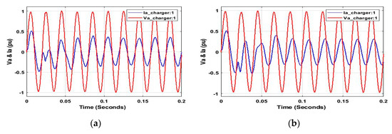 In order to validate the proposed charger’s capability in effectively responding to the charging and discharging power commands, several simulation scenarios were considered. The DC-link capacitor is capable of reactive power operation for small voltage sag compensation even if the EV is not connected. Figure 11a shows the sagged voltage waveform of a depth of 0.85 pu and the compensated load voltage waveform to nearly 0.93 pu, as shown in Figure 11b.