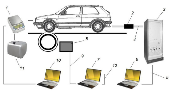 Schematic diagram of the setup used in tests. 1—Electronic scales; 2—heated filter; 3—AVL SESAM FTIR multicomponent measurement system; 4—heated gas line; 5—AVL data communication cable; 6—computer with special AVL software; 7—MD-1750 dyno control and data recording computer; 8—power absorber unit; 9—dyno date communication cable; 10—fuel consumption and data recording; 11—fuel tank; 12—screen communication cable.