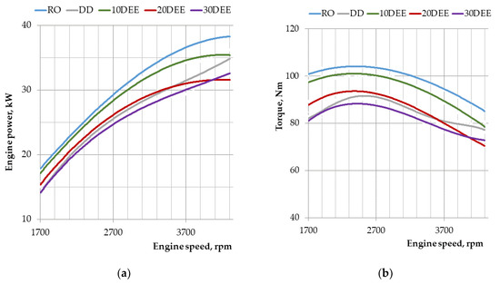 Main results of experimental data of engine performance and emissions using all previously mentioned fuels and blends are summarized in Figure 3, Figure 4, Figure 5, Figure 6, Figure 7 and Figure 8. Test results confirmed decrease of power with the addition of diethyl ether, which can be attributed to reduction of viscosity and density of the mixture. Maximal values of power were observed directly for RO that is 38.61 kW at 4200 rpm, while other fuels showed decrease from 6.2% to 17.3% presenting impact of diethyl ether. Decrease of power by 11.7% was observed also in case of DD in comparison to RO. Higher viscosity of rapeseed oil promotes better sealing of surfaces of plunger pans in older engines in such way reducing leakages. In combination with higher density of RO it promotes increase of the energy content per unit of volume and additionally increase of the energy delivered per cycle. As systems with mechanical injection control volumetrically apply the fuel in the combustion chamber, therefore this could be reason for increase of power using RO compared to DD. During the tests also was identified that 30DEE gives lower power (32.4 kW) than DD (34.7 kW). Similar reduction was observed also in case of torque demonstrating the largest values in case of RO that is 104.21 Nm and reduction for other blends that are 101.06 Nm for 10DEE, 93.80 Nm for 20DEE and 89.12 kW for 30DEE (see Figure 3).