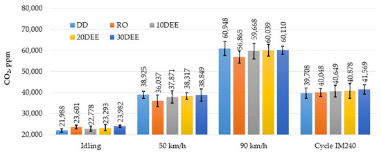 CO2 emissions of DD, RO, 10DEE, 20DEE and 30DEE in different testing conditions.