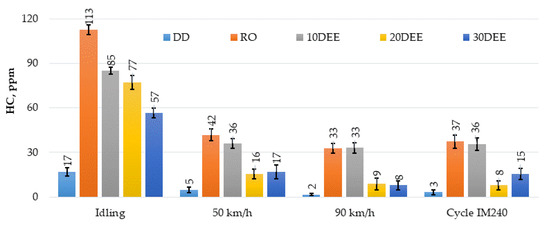 Similar situation was noticed also with hydrocarbons presenting more pronounced reduction in all realized tests, but best results in case of 20DEE are 31.5% (at idling), 62.7% (50 km/h), 72.6% (90 km/h) and 78.8% (at cycle IM-240) compared to RO (see Figure 7). In the same time DEE addition to rapeseed oil demonstrates higher HC emissions in comparison to DD. It is known that formation of hydrocarbons in the engine is very complicated and is accompanied by various factors. However, it is primarily connected with incomplete combustion generated by flame cooling and inappropriate air–fuel mixture, as also can be affected by fuel structure, operating conditions and engine load. Existence of oxygen in the chemical structure of DEE allows to reduce HC emissions more slightly depend on DEE concentration in blend. Hence, largest HC decrease was observed using 20DEE and 30DEE blends. Higher emissions sometimes using DEE blends can be observed by creation lean outer flame zone, especially in IDI engines, which are more disposed to homogenous charge. Overmixing created directly by fuels with lower density and viscosity, promote stays beyond the flammability limit [21].