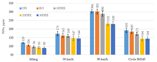There was also observed decrease of NOx emissions for all mentioned fuels and testing conditions. Largest decrease was observed during 90 km/h and cycle IM240 reaching 22.1% to 23.9% reduction for 20DEE and 30DEE (see Figure 8) in comparison to neat RO. Such decrease in NOx emissions can be explained by lower combustion temperature due to a low heating value and high latent heat of vaporization of DEE, in such way cooling the intake charge and reducing the peak flame temperature and additionally NOx. Prevalence of lower peak cycle temperature was considered as a reason for not favoring the thermal prompt reactions responsible for the formation of higher levels of NOx [22]. Such reduction can be more rapid with increase of the percentage of diethyl ether in the blend and is detected by other researchers [23].