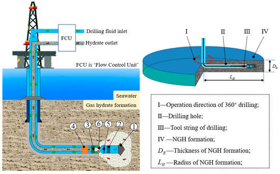 As a new energy source, marine natural gas hydrate (NGH). may become a replacement energy source with huge reserves after shale gas and coal bed methane [1,2]. To date, for the exploitation of NGH with shallow seabed depth and poor cementation, traditional NGH drilling and production methods may lead to the disorderly decomposition of non-diagenetic NGH on the seabed, thereby affecting the stability of hydrate reservoir [3,4]. Therefore, based on the above reasons, Zhou Shouwei, an academician of the Chinese Academy of engineering, proposed solid-state fluidized mining (SSFM) method [5,6]. In May 2017, in the “Shen Hu Sea Area” of the South China Sea, SSFM was successfully implemented for the first time for deep-sea shallow non-diagenetic NGH, which proved the feasibility of “SSFM principles” for NGH. However, the drilling method used in this trial mining operation is a conventional drilling method, which mainly has the following problems: (1) the produced fluid has high sand content and low NGH recovery efficiency; (2) the NGH layer has a narrow pressure window density and is easy to leak; (3) the borehole wall stability of the open hole section is poor, and the produced fluid has a fast return flow rate. It is easy to cause the collapse of the shaft wall and bury the underground tools [7,8]. Therefore, in view of the above engineering problems, the NGH drilling and production method based on double-layer continuous-pipe double-gradient drilling (DDG) method has been proposed.