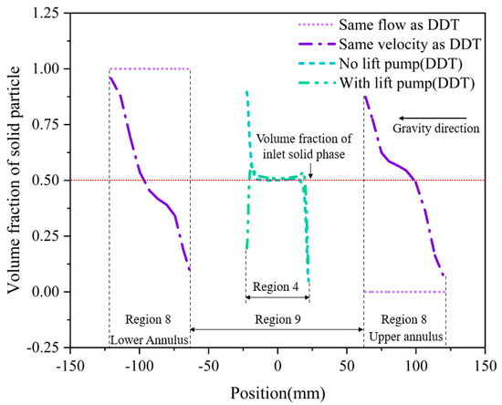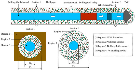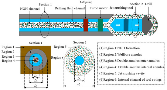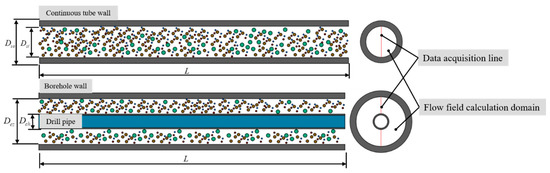 When the DDG method are used, the solid particles such as NGH and sediment are transported in inner pipe of double-layer continuous pipe in the horizontal section. Because the inner surface of continuous pipe is relatively smooth, and the solid particle migration channel size of DDG method is smaller than that of traditional drilling method, as shown in Figure 5. Therefore, under the same conditions, the internal flow velocity of the DDG method is relatively high. Under the influence of fluid-lift and radial pulsation, the exchange of momentum and mass exchange between solid particles. The particles finally enter the suspended migration state. In addition, the DDG method is also provided with a lift pump device for assisting the return of the multiphase mixed slurry of sediment and NGH in the horizontal section, which will also have a beneficial effect on the migration of solid phase particles in the horizontal section [19,20].